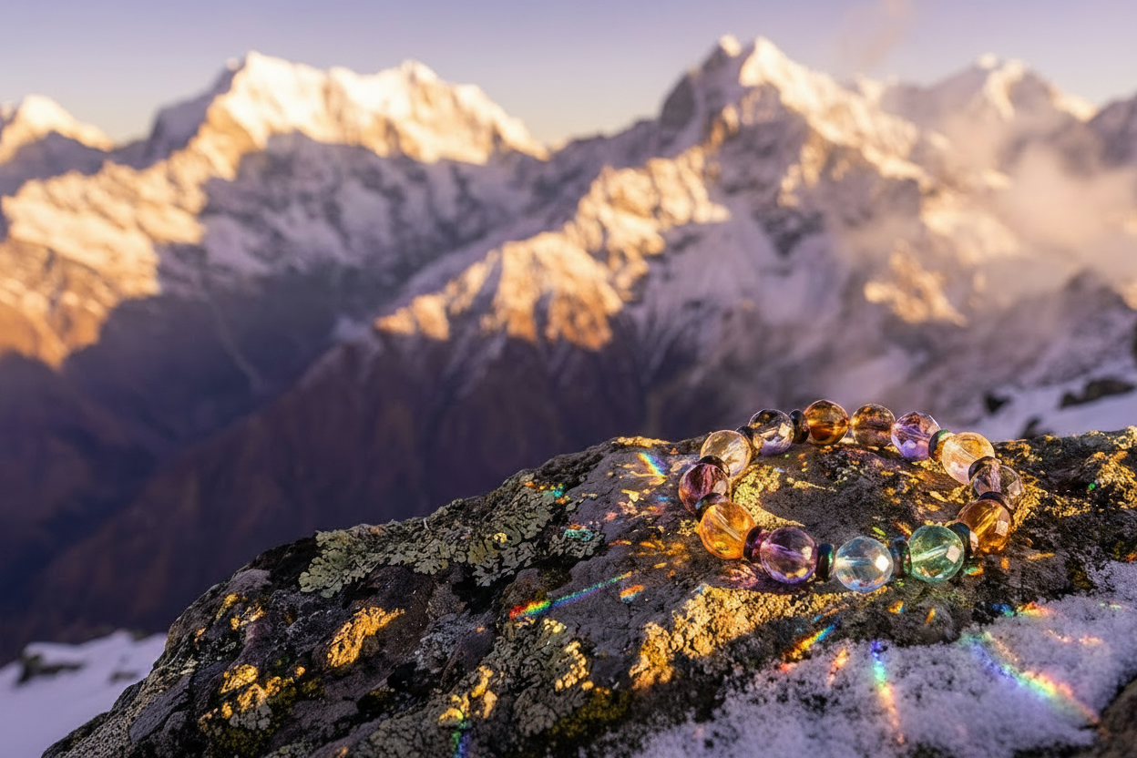 Himalayas — and deep within that geological violence, something extraordinary crystallized. Extreme heat, immense pressure, and mineral-rich waters slowly formed the stones we now carry: Clear Quartz, Amethyst, Rose Quartz, and Citrine.